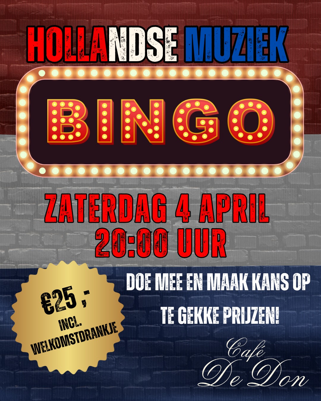 Meld je nu aan voor dé hollandse muziekbingo in Café de Don op 4 April 2026. De kosten zijn 25 euro per persoon inclusief welkomstdrankje. Je maakt dan automatisch kans op mooie prijzen én gegarandeerd een gezellige avond.